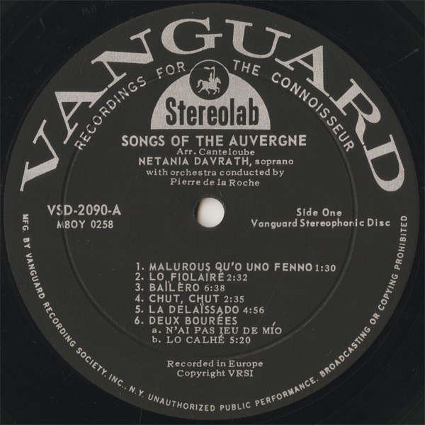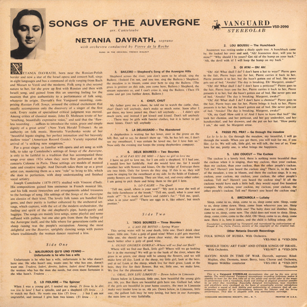 カントルーブ編 『オーベルニュの歌 Vol. 1』女房持ちはかわいそう,バイレロ,シュ・シュ,捨てられた乙女,2つのブーレ〔わたしには恋人がいない,うずら〕 ,3つのブーレ〔泉の水,どこに羊を放そう,あちらのリムーザンに〕 ,せむし,オイ、アヤイ!,草原を通っておいで,カッコウ,子守唄