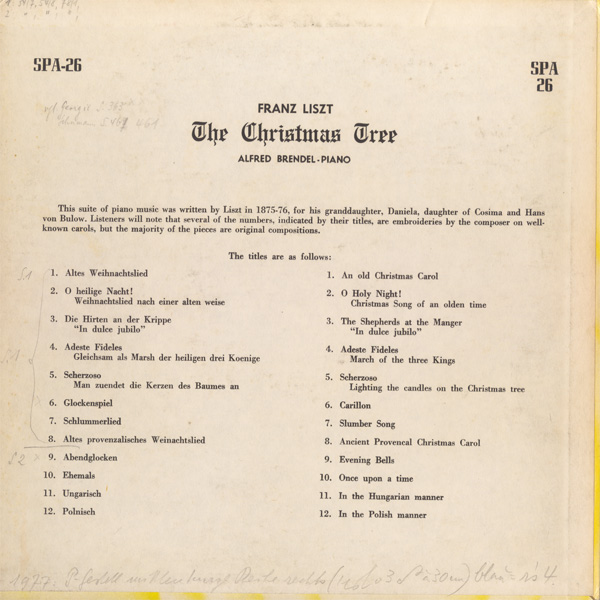 大変珍しいリストの曲集,しかもブレンデルのデビュー録音,SPA Recordsはアドラー/ウィーン・フィルのマーラーやシュタイングルーバーのシェーンベルクなどマニアックなレパートリーを誇った,この曲集もブレンデルによる選曲というよりもSPA Recordsによる企画なのだろう,浅いキズ少々,ジャケット少傷み