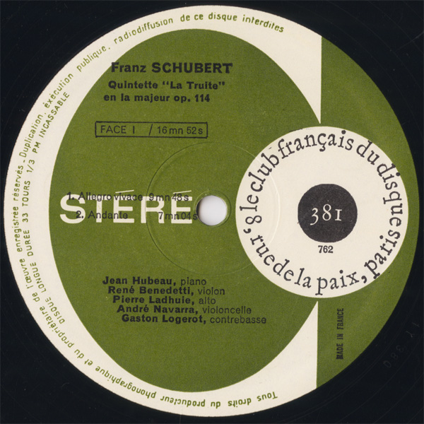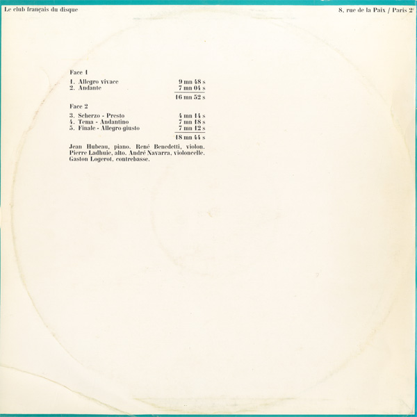 ジャン・ユボー(pf) ルネ・ベネデッティ(vn) ピエール・ラデュイユ(va) アンドレ・ナヴァラ(vc) ガストン・ロジュロ(cb)