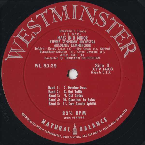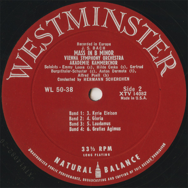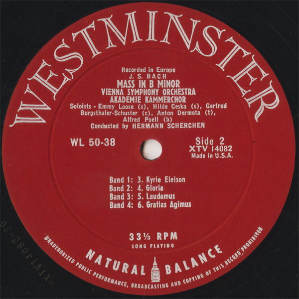 ヘルマン・シェルヘン(cond) ウィーンso. ウィーン・アカデミーcho. エミー・ローゼ,ヒルデ・チェスカ(s) ゲルトルート・ブルクシュターラー=シュスター(ca) アトン・デルモタ(t) アルフレート・ペル(bs)