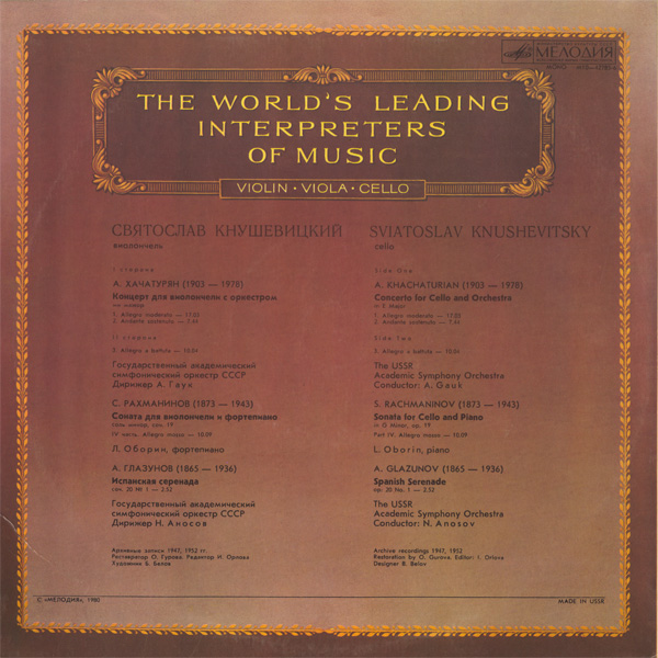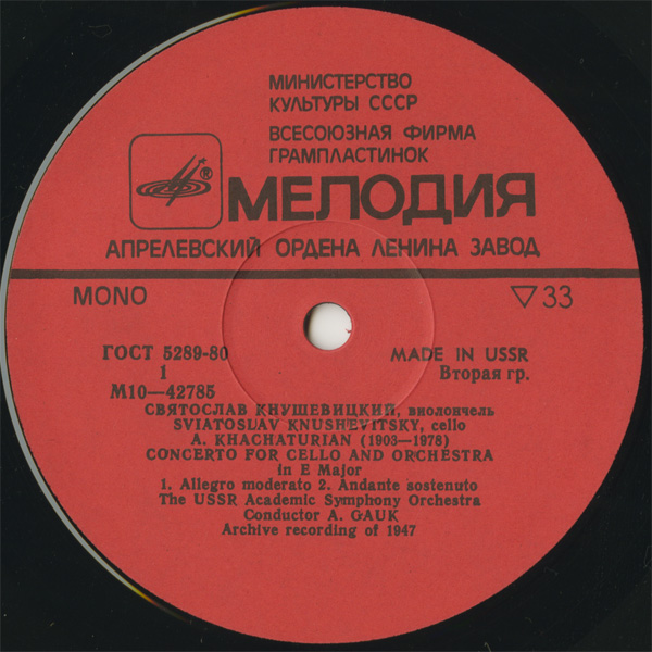スヴャトスラフ・クヌシェヴィツキー(vc) アレクサンドル・ガウク(cond) USSRアカデミーso. レフ・オボーリン(pf) ニコライ・アノーソフ(cond) USSRアカデミーso.