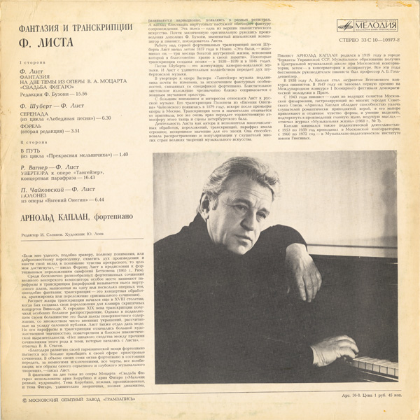 ジャケットに大書の献辞とサイン,コーガンの伴奏者と思われているが、実はゴリデンヴェイゼル門下の隠れた名ピアニスト,独奏録音は僅かでステレオはこの盤が唯一,ジャケット裏の写真が良い
