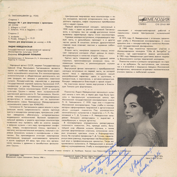 ジャケット裏に献辞とサイン,ネヴェドムスカヤはこれが唯一の録音,もう少し録音があったらと思わせる,サインの字が美しい