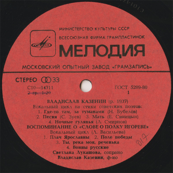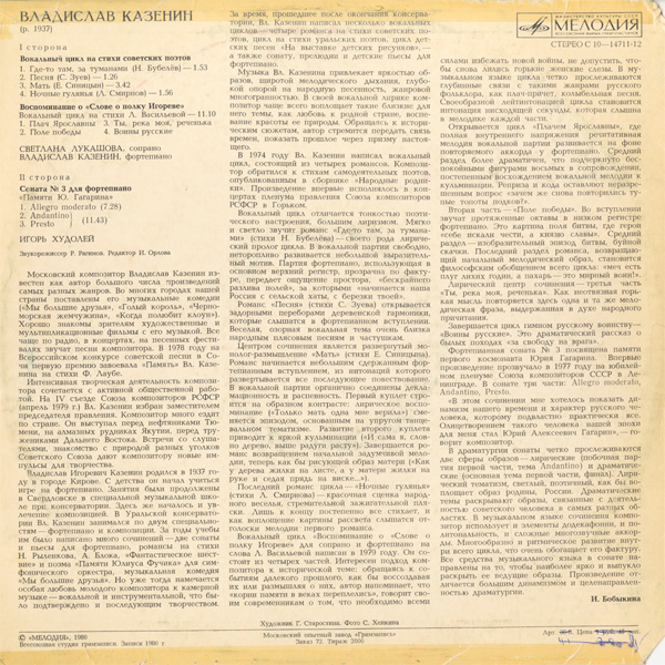 V. カゼニン 《ソ連の詩による歌曲集》〔霧の向こうに,歌,母,夜の祝祭〕 《『イーゴリ遠征譚』追想》〔ヤロスラヴナの嘆き,勝利の後,川よ、私の川よ,ロシアの戦士たち〕 ,ピアノ・ソナタ第3番《Y. ガガーリンの思い出に》