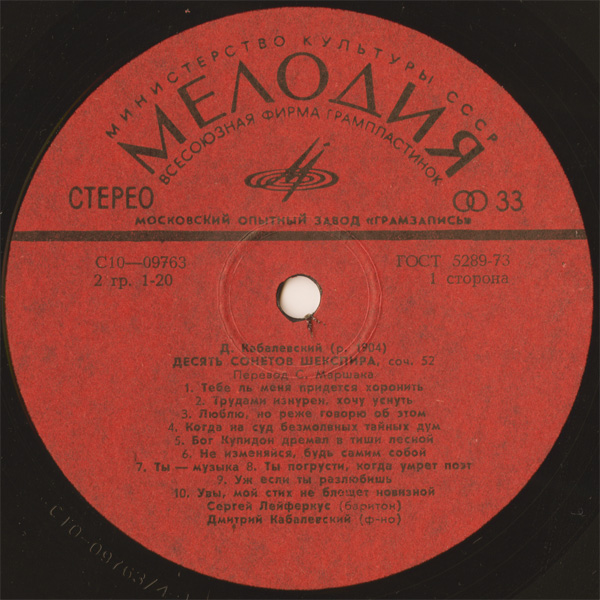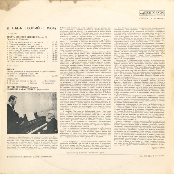 カバレフスキー 《シェイクスピアの10のソネット》op. 52〔第81番, 27番, 102番, 30番, 153番, 13番, 8番, 71番, 90番, 76番〕,序奏とレチタティーヴォ付きの6つの歌曲《時間》op. 100〔序奏,まさに同じ,列車に乗って,時間,韻,不滅,友へ〕