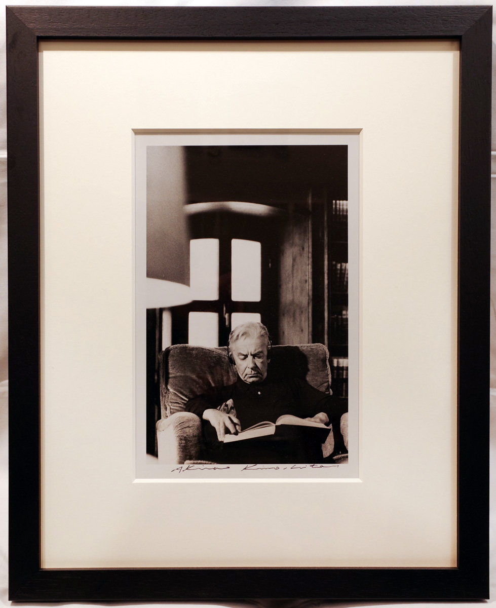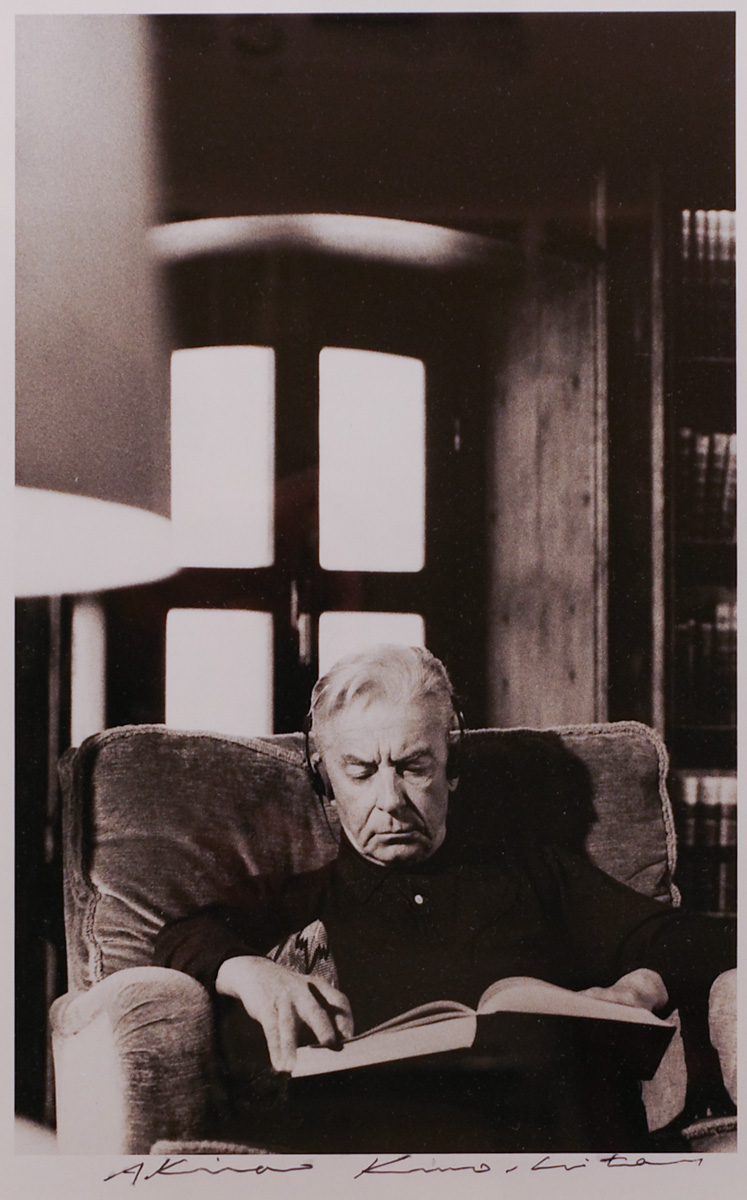 この有名な写真は、Walkmanを聴きながら総譜をチェックしている一景です。おそらく『巨匠カラヤン』制作時に、ザルツブルクのカラヤン自邸で撮影されたものかと思います。写真右下に木之下氏によるサインの入ったオリジナルプリントです。
