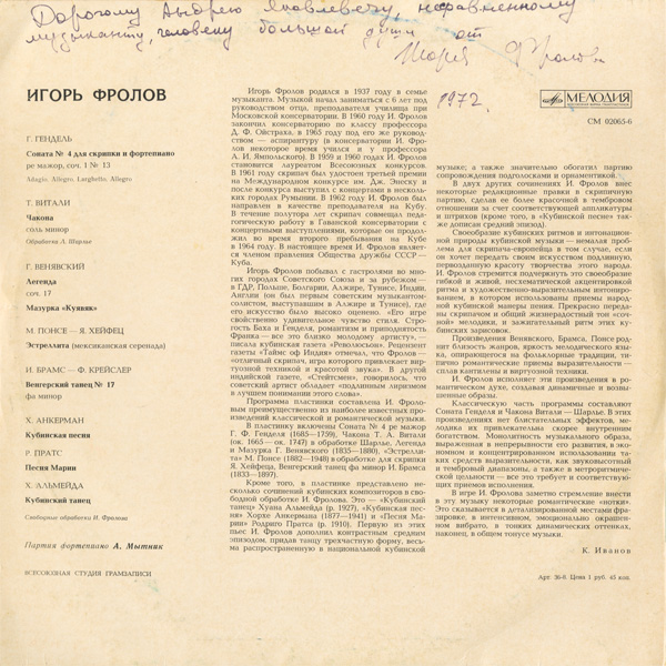 ジャケット裏に献辞とサイン,ヤンポルスキー、オイストラフとエリートコースを経てモスクワ音楽院教授を長く務めたが、なぜか録音は2枚しか残さなかった