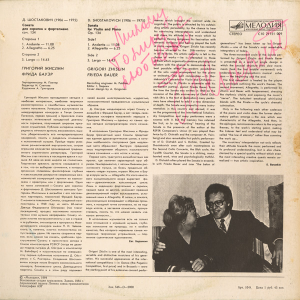ジャケット裏に大書の献辞とサイン,ジスリンは録音は少ないがオイストラフの弟子でもそれと知られた人,オイストラフ最後の伴奏者バウエルとの共演というのも感慨深い,ジャケット少破れ他少傷み