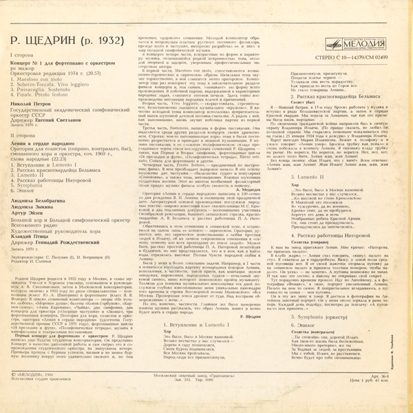R. シチェドリン ピアノ協奏曲第1番(1974) ,オラトリオ《人民の心の中のレーニン》