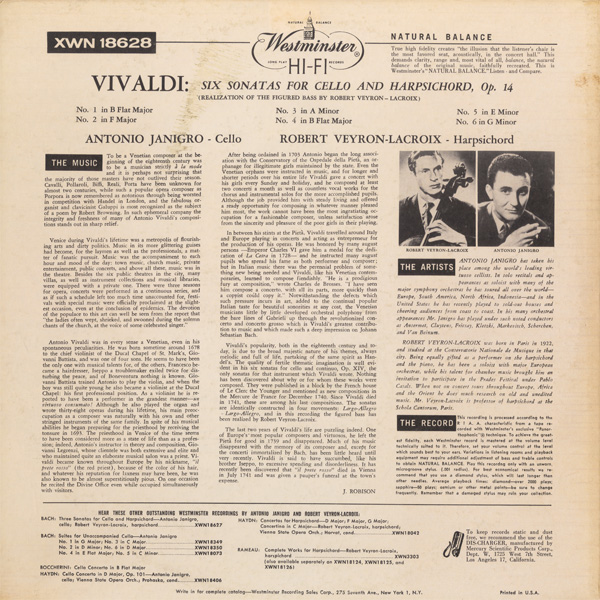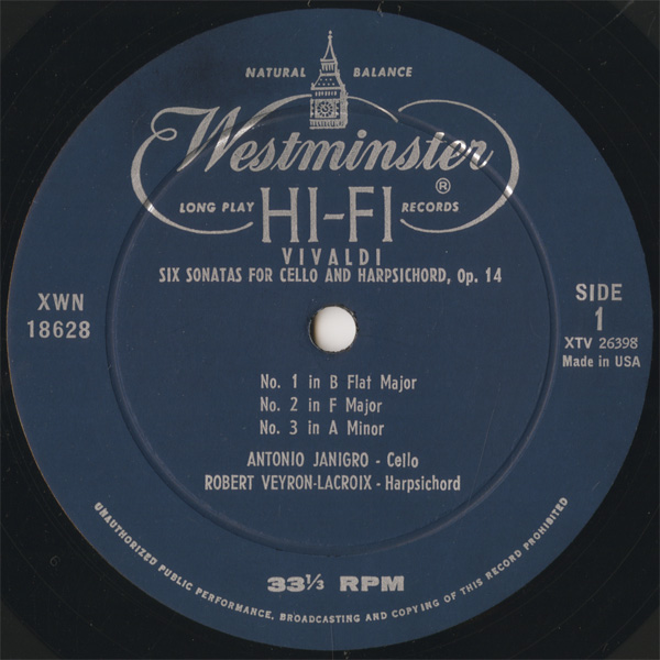 ヴィヴァルディ(ヴェイロン=ラクロワ編) 6つのチェロ・ソナタ〔第1番 変ロ長調,2番 ヘ長調,3番 イ短調,4番 変ロ長調,5番 ホ短調,6番 ト短調〕