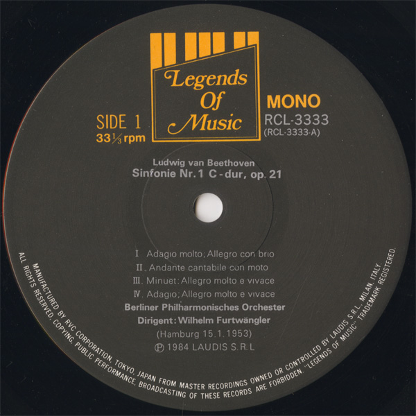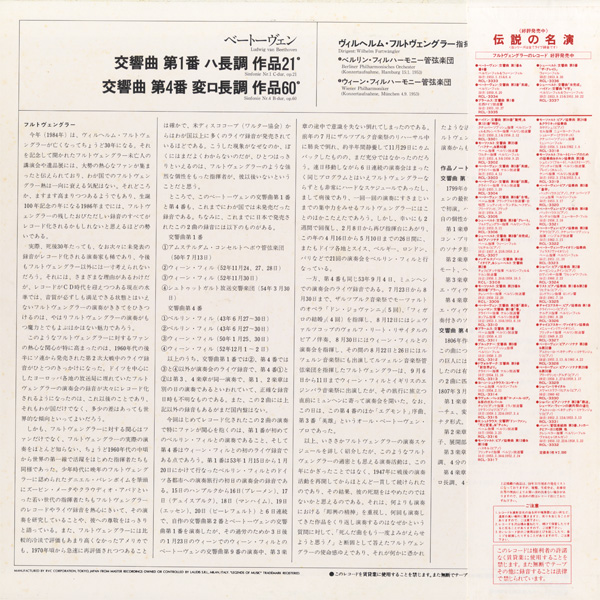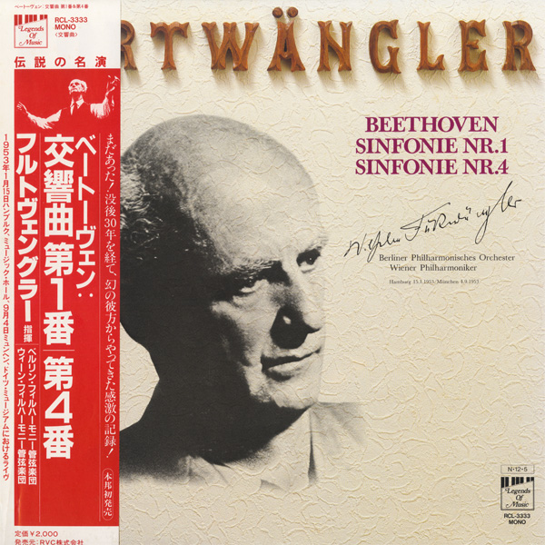 1番はフルトヴェングラー最後の録音(解説に録音についての詳細が書かれているのだが間違い) ,様々な指揮者によるベートーヴェン全集Movimento Musica盤が初出となるが、LP単独発売はこの盤のみ,4番はFE盤とほぼ同時期の発売,いずれにしても貴重な1枚,ジャケット少シミ等